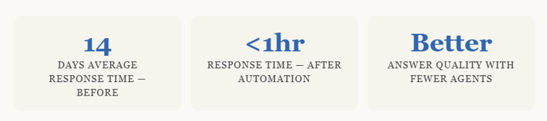 Today, that same query gets a response that is immediate for straightforward cases, and substantially faster for anything that needs a human to review. And we are doing this with fewer people than before. Not because we fired anyone. But because the headcount required to run the same volume of work shrunk naturally, over time as automation absorbed the repetitive load. The people who stayed are handling better work. More complex cases. More judgment-required situations. Less copy-paste.